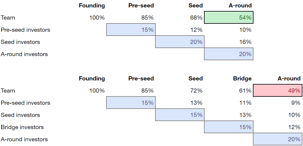 If we expect to run a preseed and seed round before the A-round (and leave room for a bridge round, just in case), we must ensure that the dilution stays within limits. For example, 10% equity given out in a preseed round and 20% in a seed round equals 28% dilution, leaving room for one smallish bridge round (below 15%). Preseed dilution of 10% with seed round dilution of 10% would leave more room to maneuver.